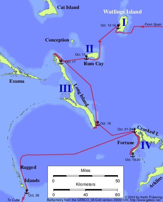 Map of the Watlings Island route (Murdock 1884, Morison 1942) |
